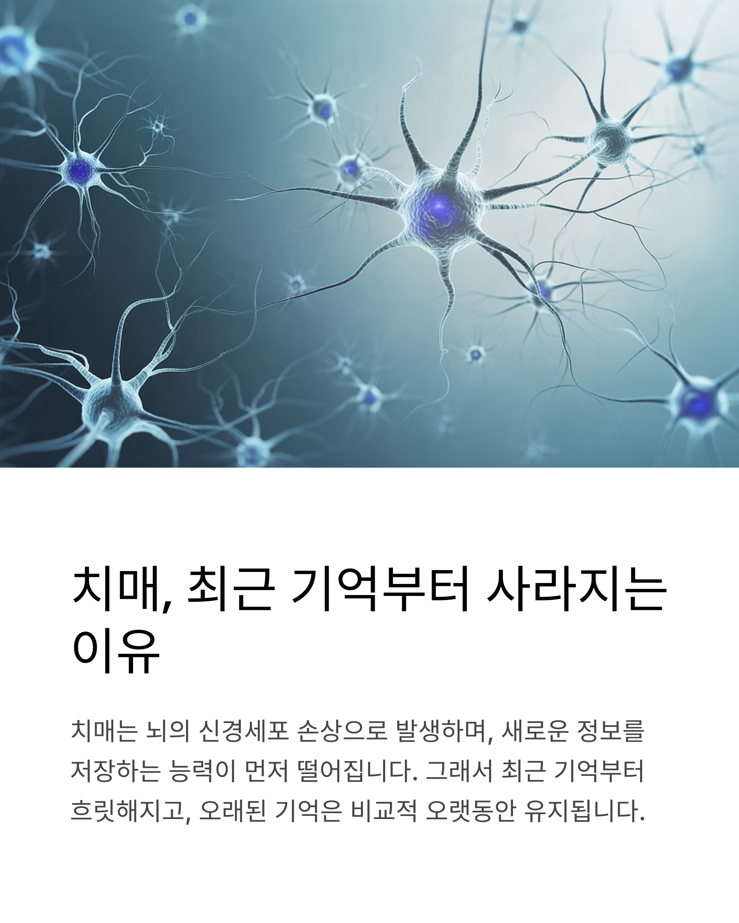 치매는 뇌의 신경세포가 손상되면서 발생하며, 특히 새로운 정보를 저장하는 능력이 먼저 떨어집니다.