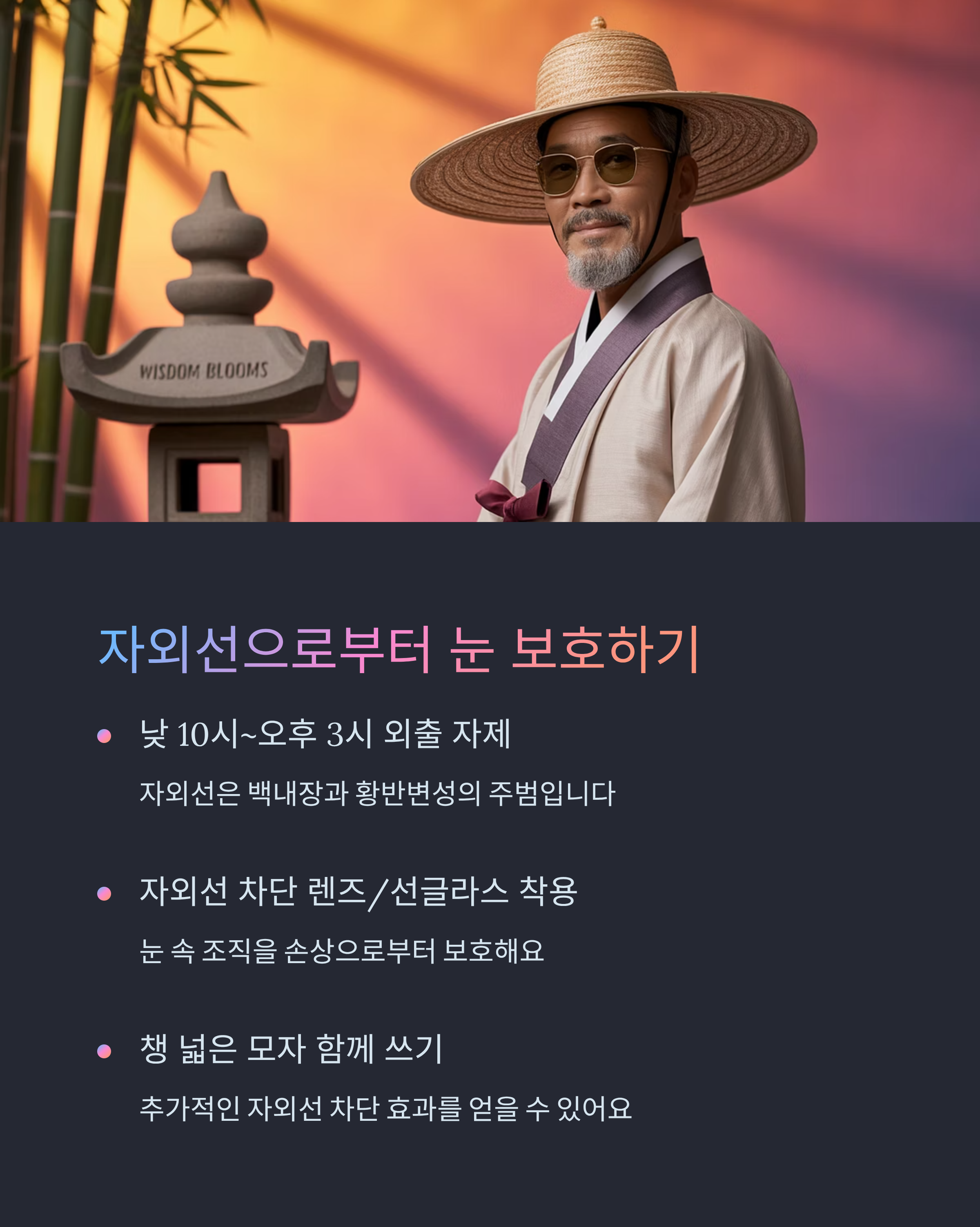 - 자외선 차단 렌즈 or 선글라스 착용 필수