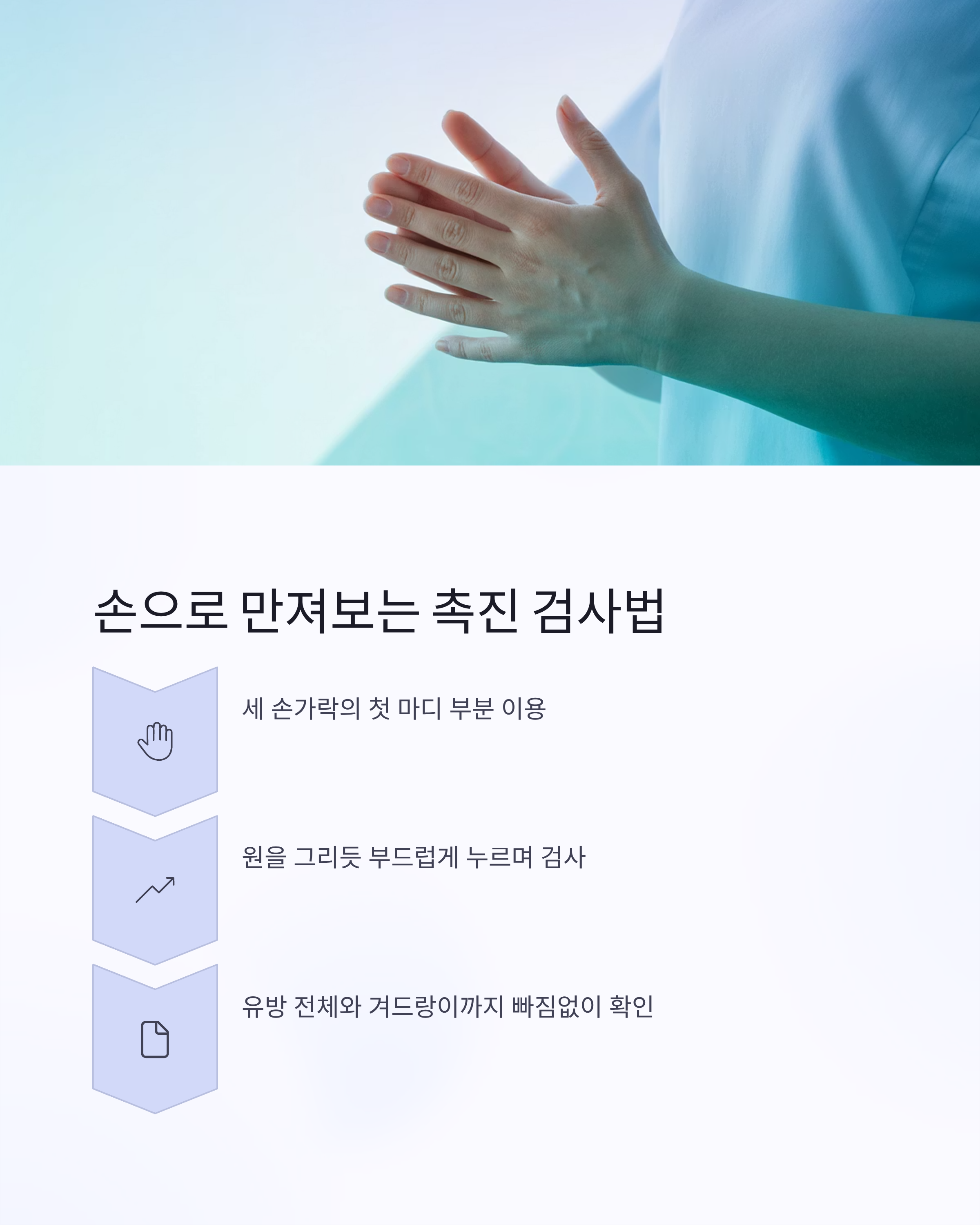 유방 전체와 겨드랑이 부위까지 빠짐없이 검사하며 멍울, 단단한 부분, 통증이 있는지 확인합니다.
