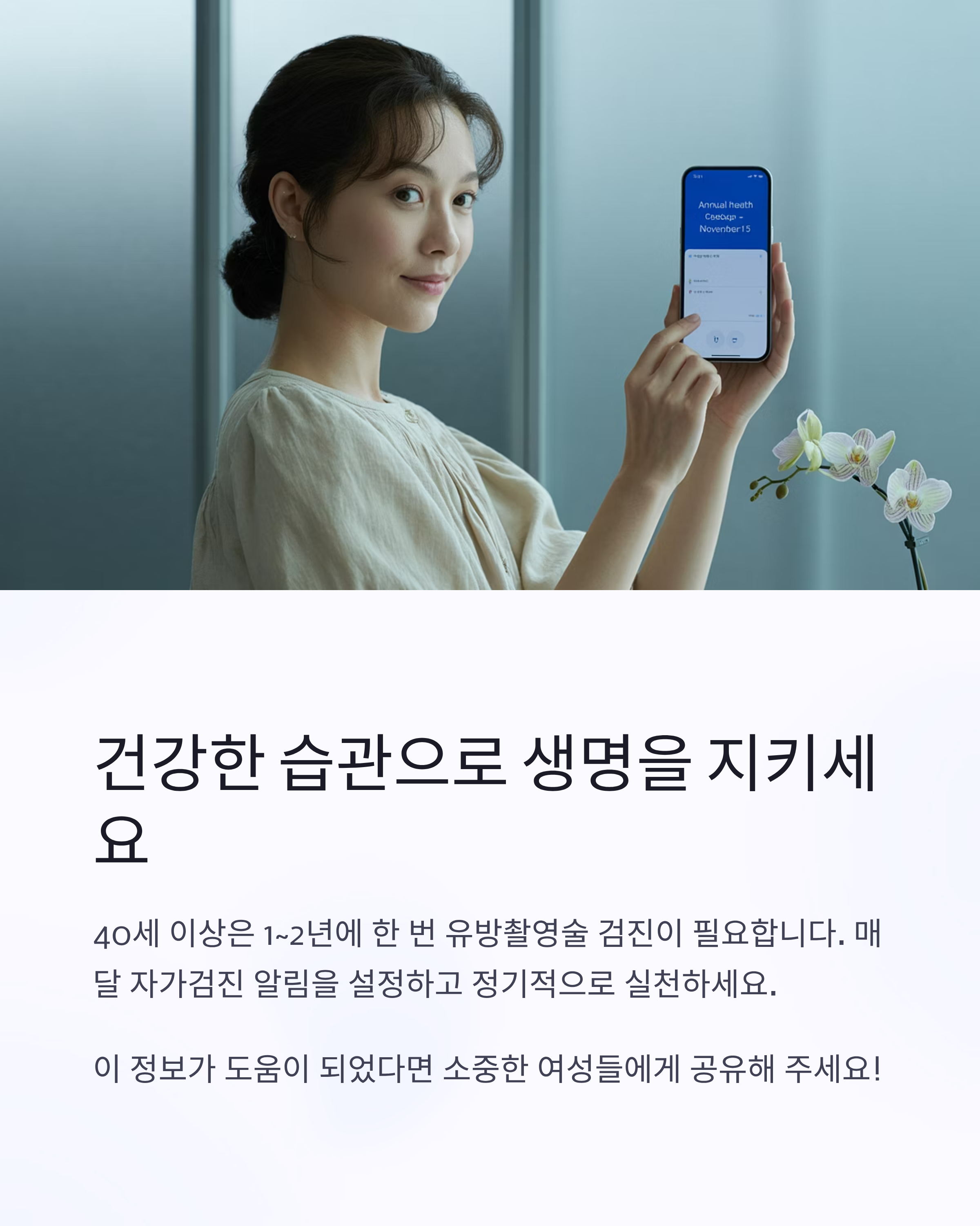 정확도를 높일 수 있습니다. 특히 40세 이상 여성은 1~2년에 한 번 유방촬영술을 받는 것이 권장됩니다.