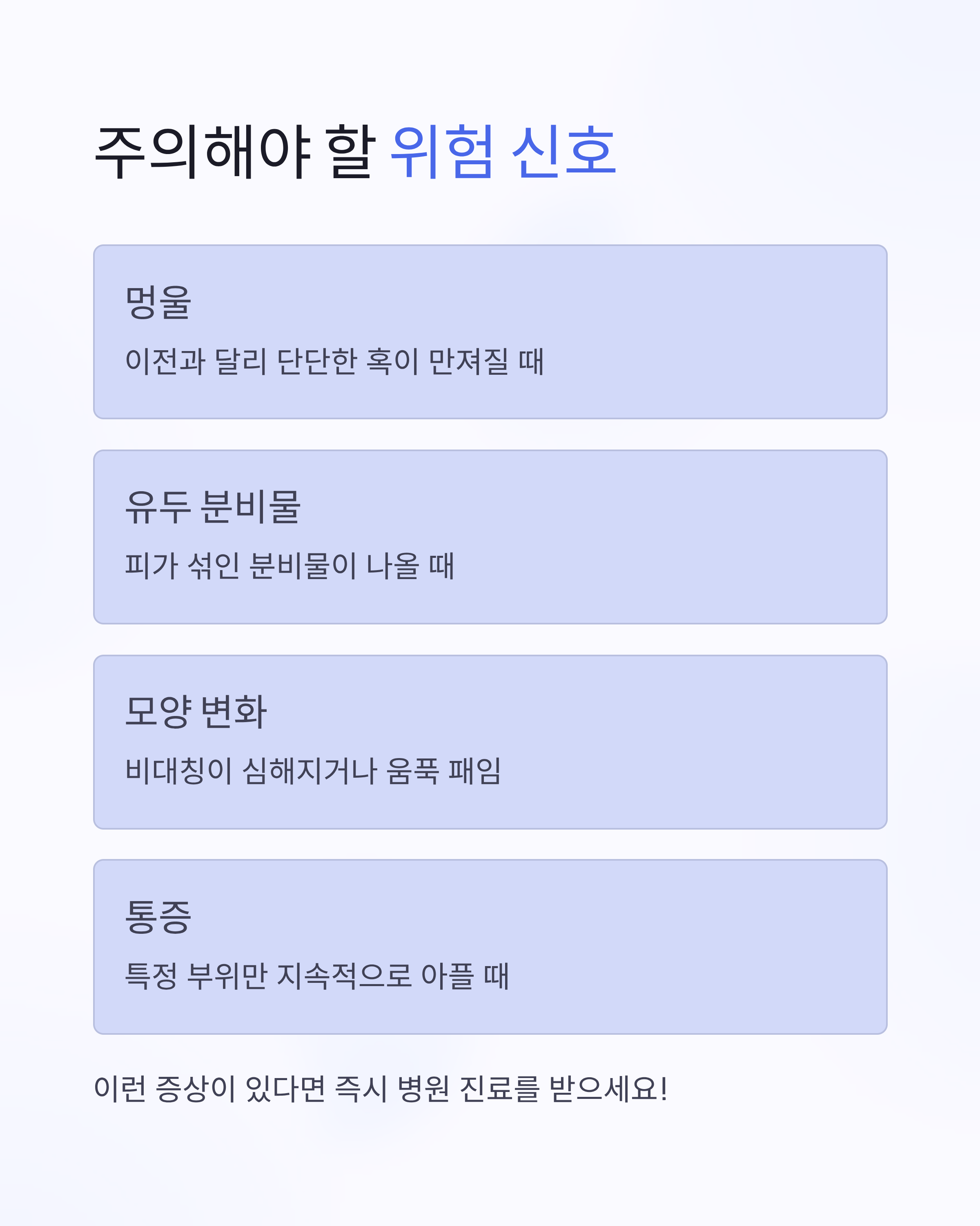 유두 분비물 | 피가 섞인 분비물 또는 끈적한 분비물이 나올 때 |