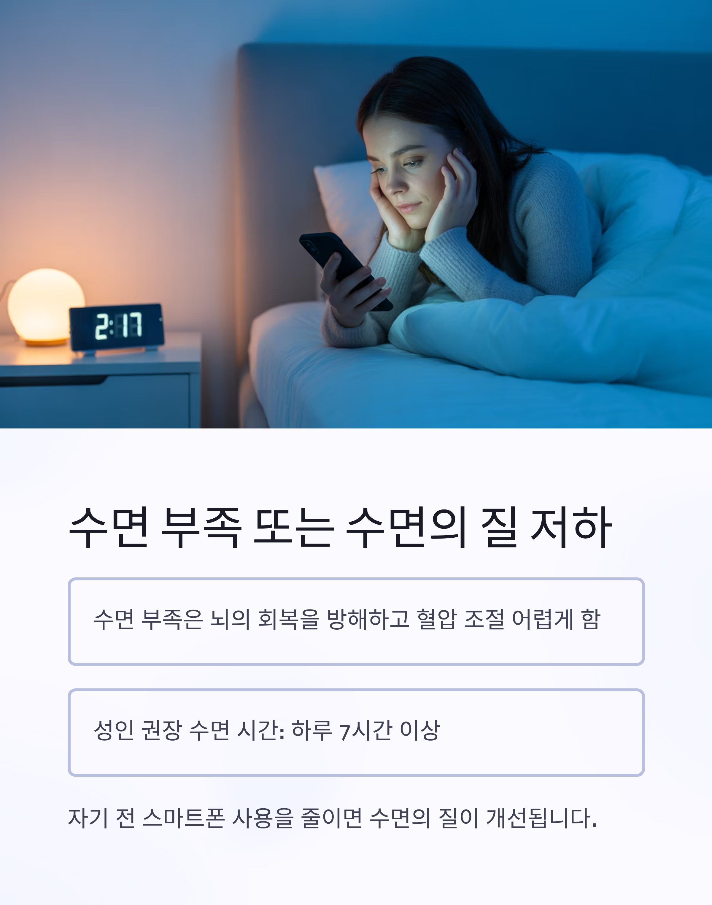 자기 전 스마트폰 사용을 줄이는 것이 수면 질 개선에 효과적입니다.