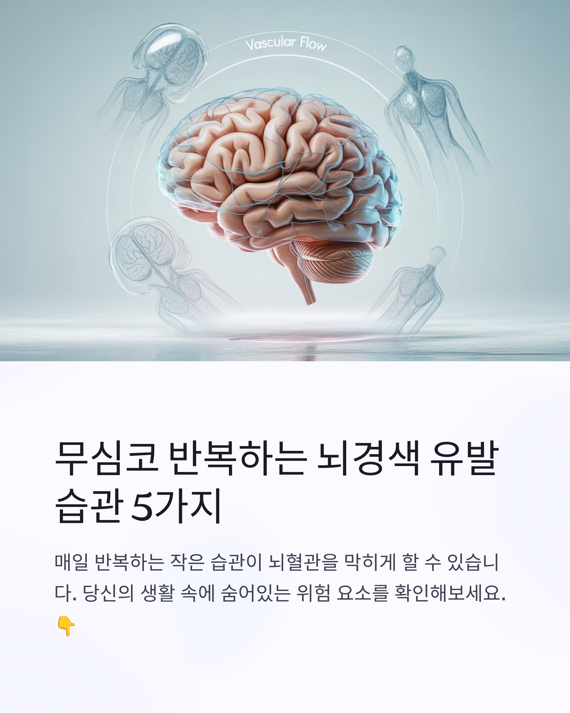 뇌경색은 예고 없이 찾아오는 무서운 질환으로, 뇌혈관이 막히면서 뇌조직이 손상되는 질병입니다. 일상에서 반복되는 작은 습관들이 뇌경색의 위험을 크게 높일 수 있다는 점에서 주의가 필요합니다. 이번 글에서는 뇌경색 위험을 높이는 대표적인 생활습관 다섯 가지를 소개하며, 이를 예방하기 위한 방법도 함께 알려드립니다.