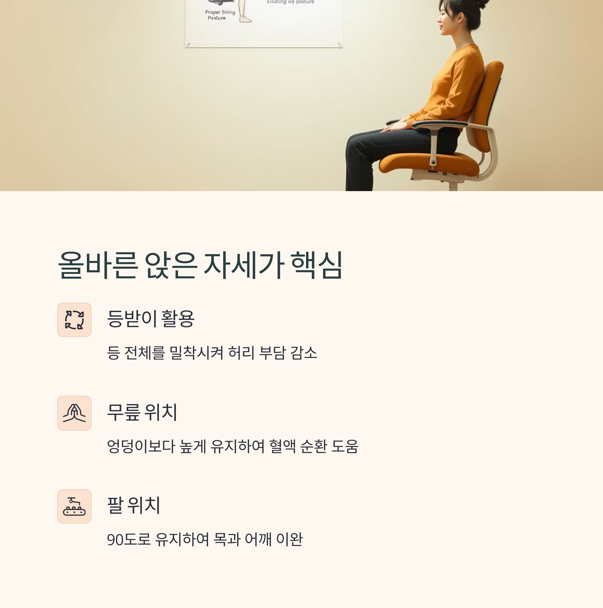 앉은 자세를 하루 한 번만이라도 점검하는 것, 그것이 작은 건강의 시작입니다.