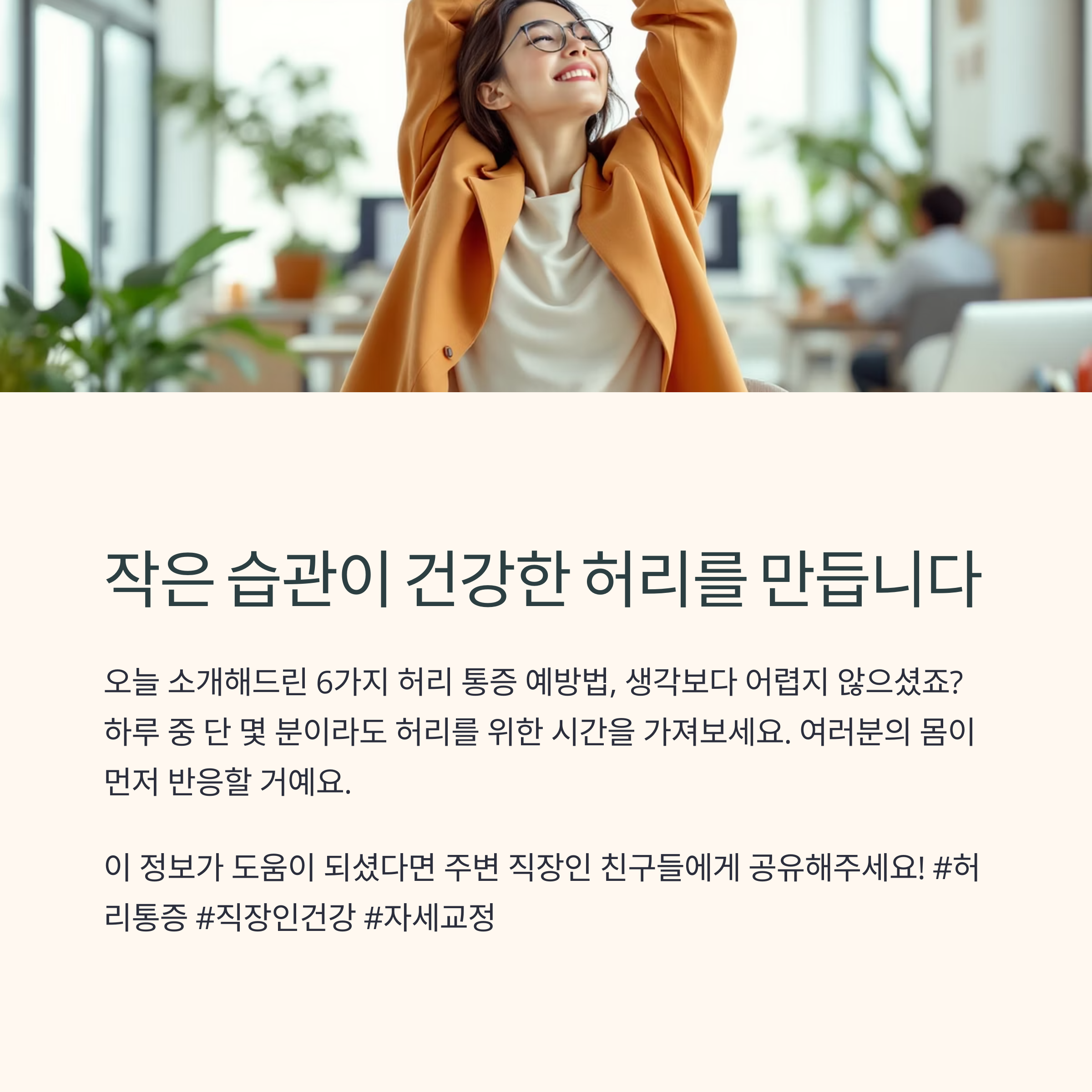 오늘 소개해드린 6가지 허리 통증 예방법, 생각보다 어렵지 않으셨죠? 건강은 하루아침에 이루어지지 않지만, 오늘의 작은 실천이 모여 내일의 건강한 삶을 만들어냅니다. 하루 중 단 몇 분이라도 허리를 위한 시간을 가져보세요. 분명 여러분의 몸이 먼저 반응할 거예요. 앞으로도 건강하고 활기찬 일상을 위해, 저와 함께 꾸준히 실천해 나가요!