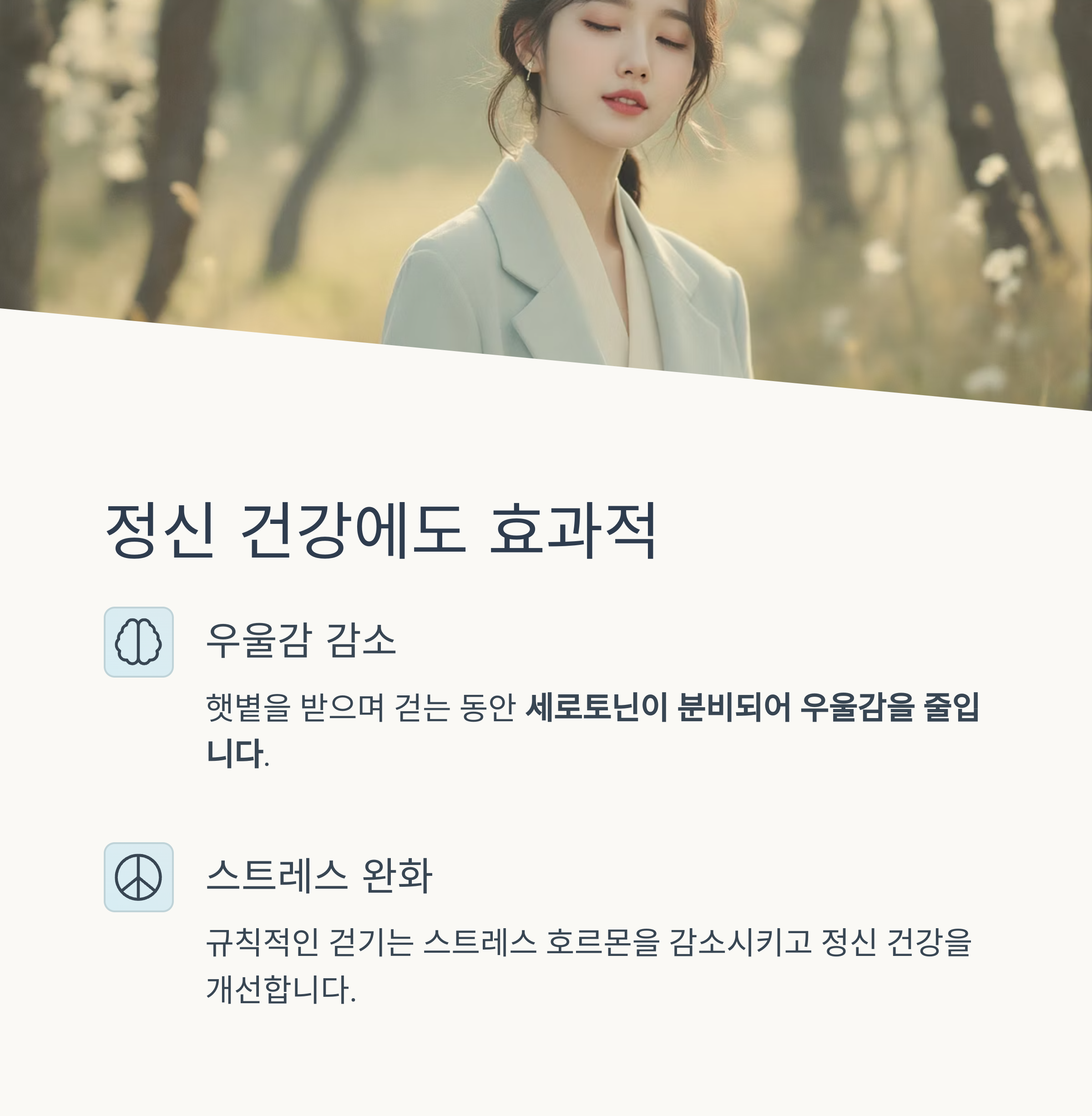 햇볕을 받으며 걷는 동안 세로토닌이 분비되어 우울감을 줄이고