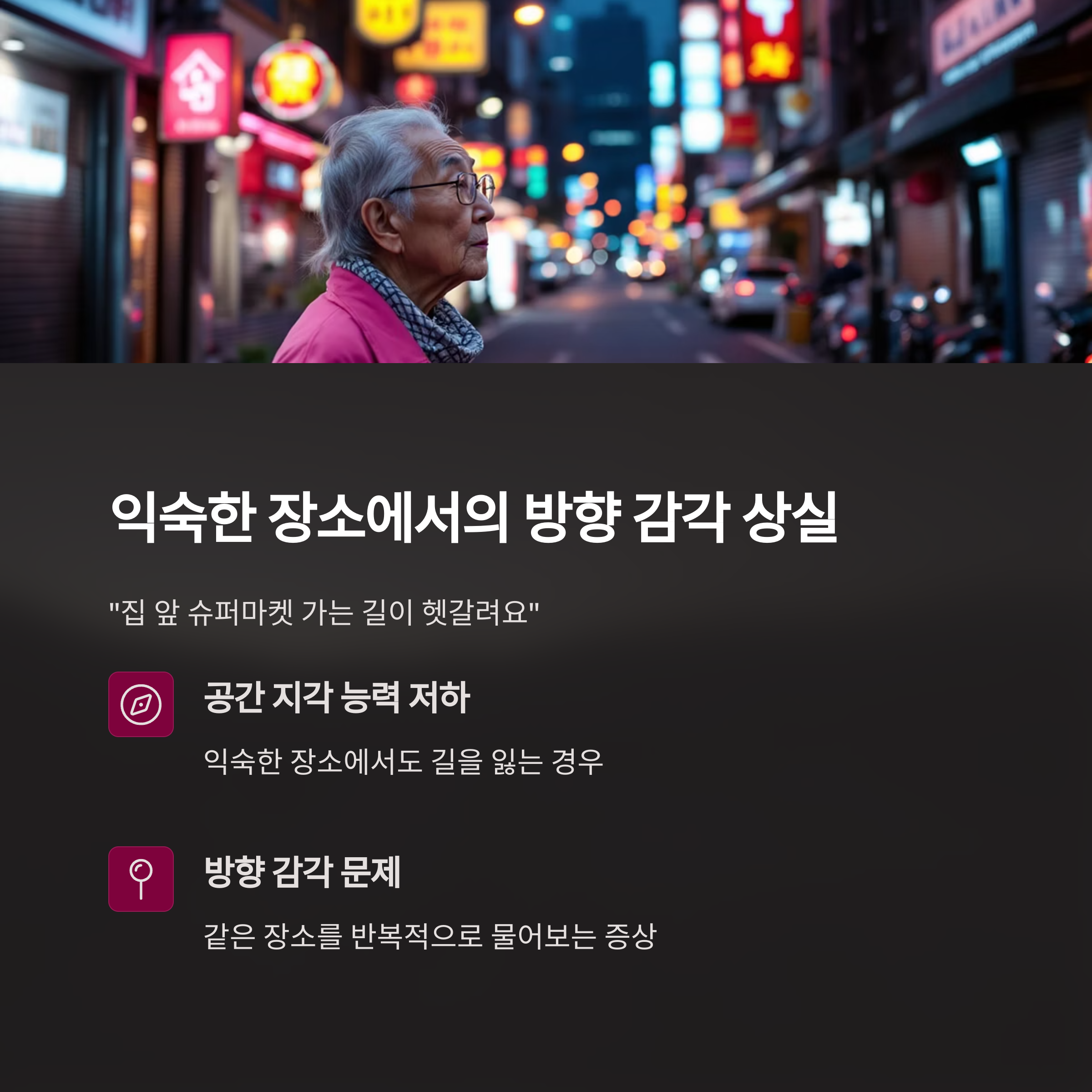 | 방향 감각 상실 | 익숙한 장소에서도 길을 잃음 |