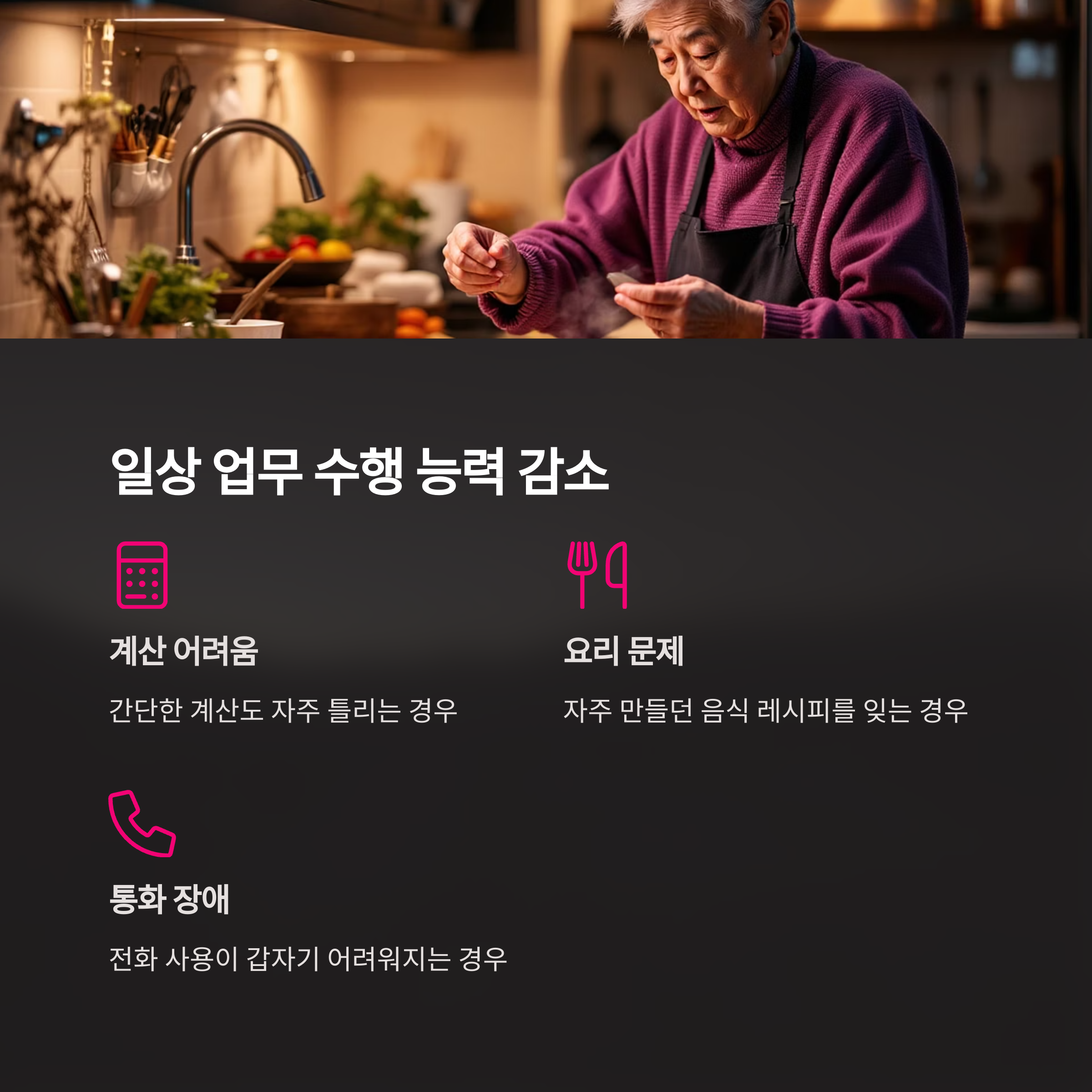 | 일상 업무 장애 | 요리, 계산, 통화 등 수행 능력 저하 |