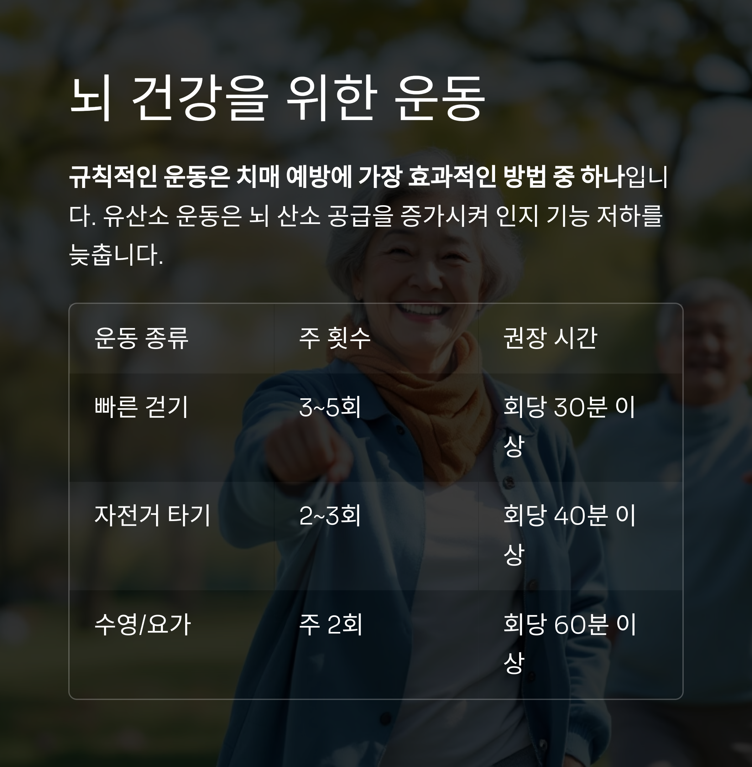 규칙적인 운동은 치매 예방에 가장 효과적인 방법 중 하나입니다.
