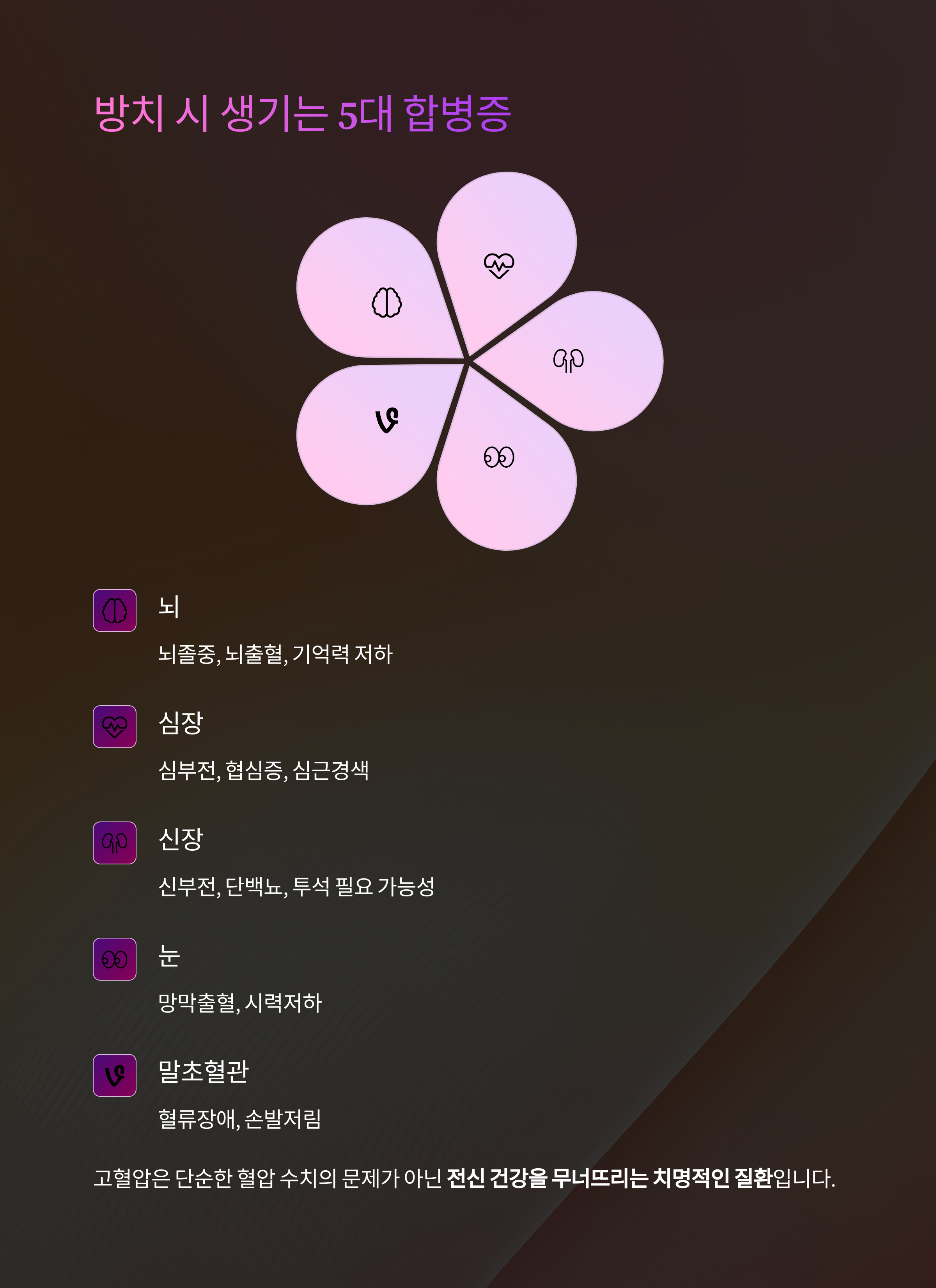 이처럼 고혈압은 단순히 혈압 수치의 문제가 아니라 전신 건강을 무너뜨리는 치명적인 질환입니다.