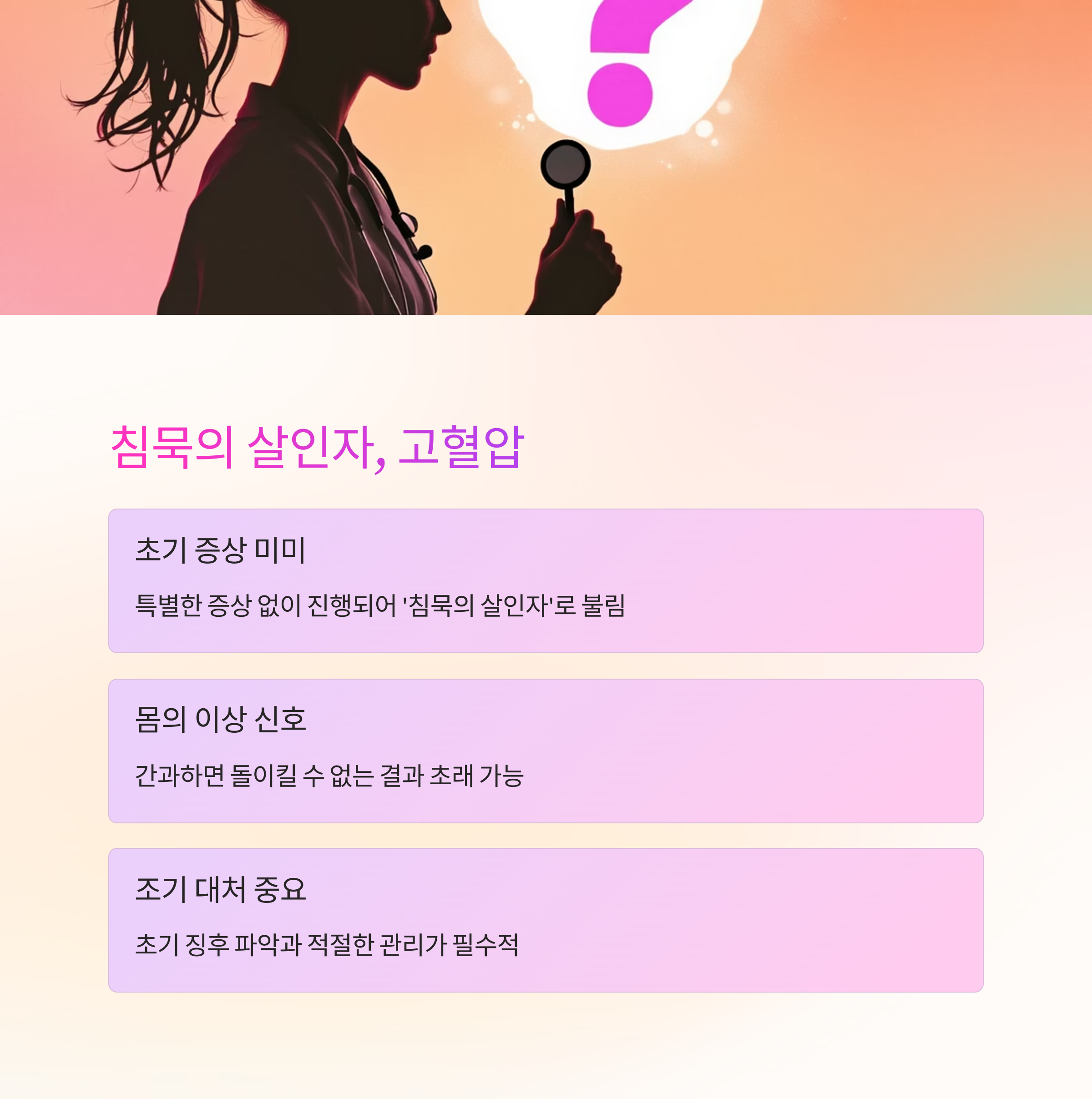 고혈압은 초기엔 뚜렷한 증상이 없어 놓치기 쉽지만, 방치하면 생명을 위협하는 합병증으로 이어질 수 있습니다.