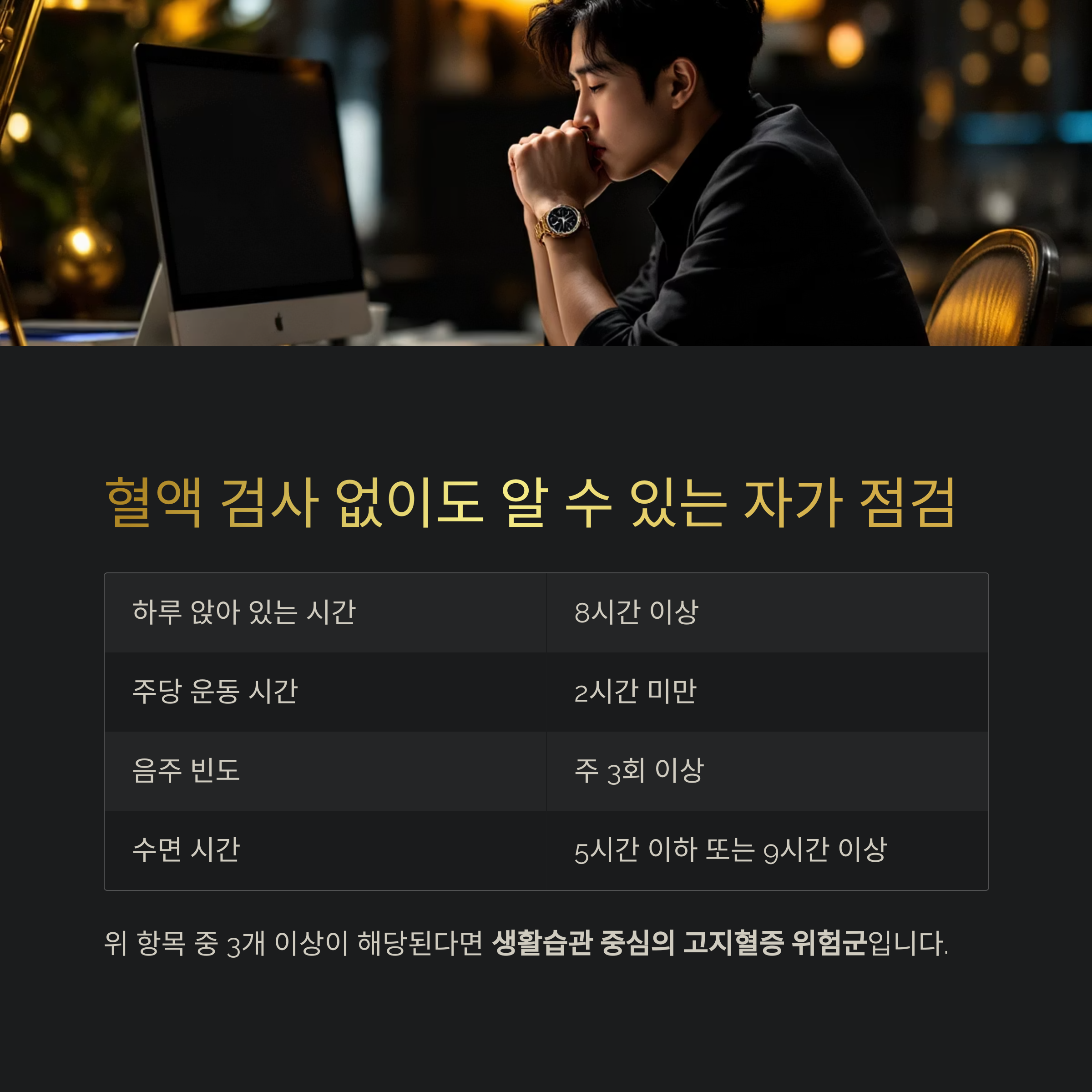 고위험군을 구분할 수 있는 생활 습관 지표를 안내드립니다.