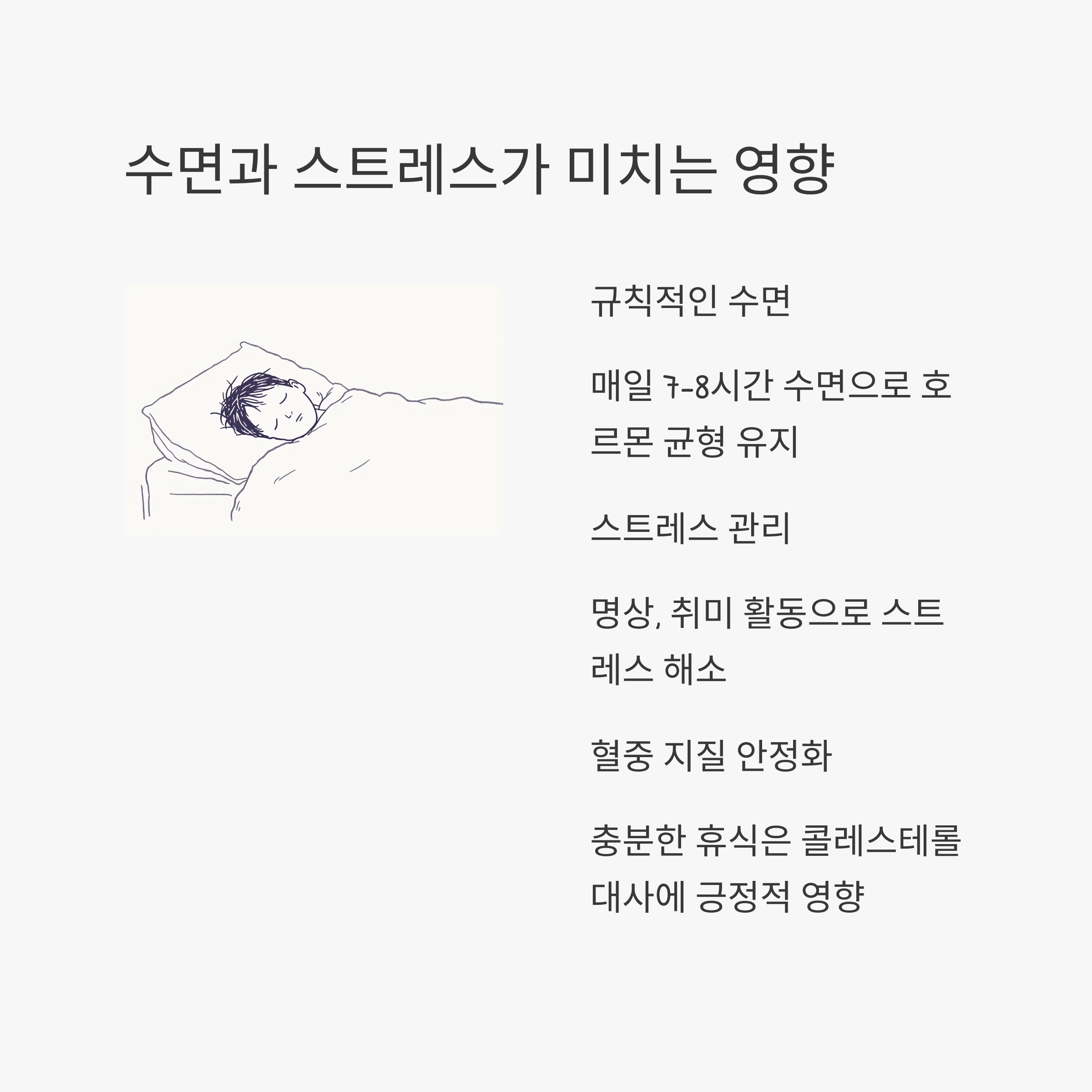 수면 부족이나 만성 스트레스는 콜레스테롤 대사에 부정적인 영향을 미칩니다.