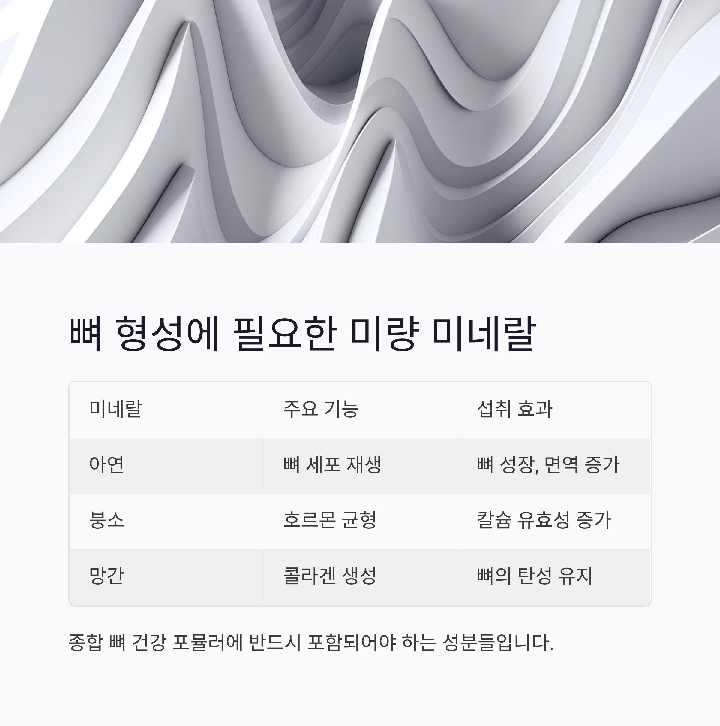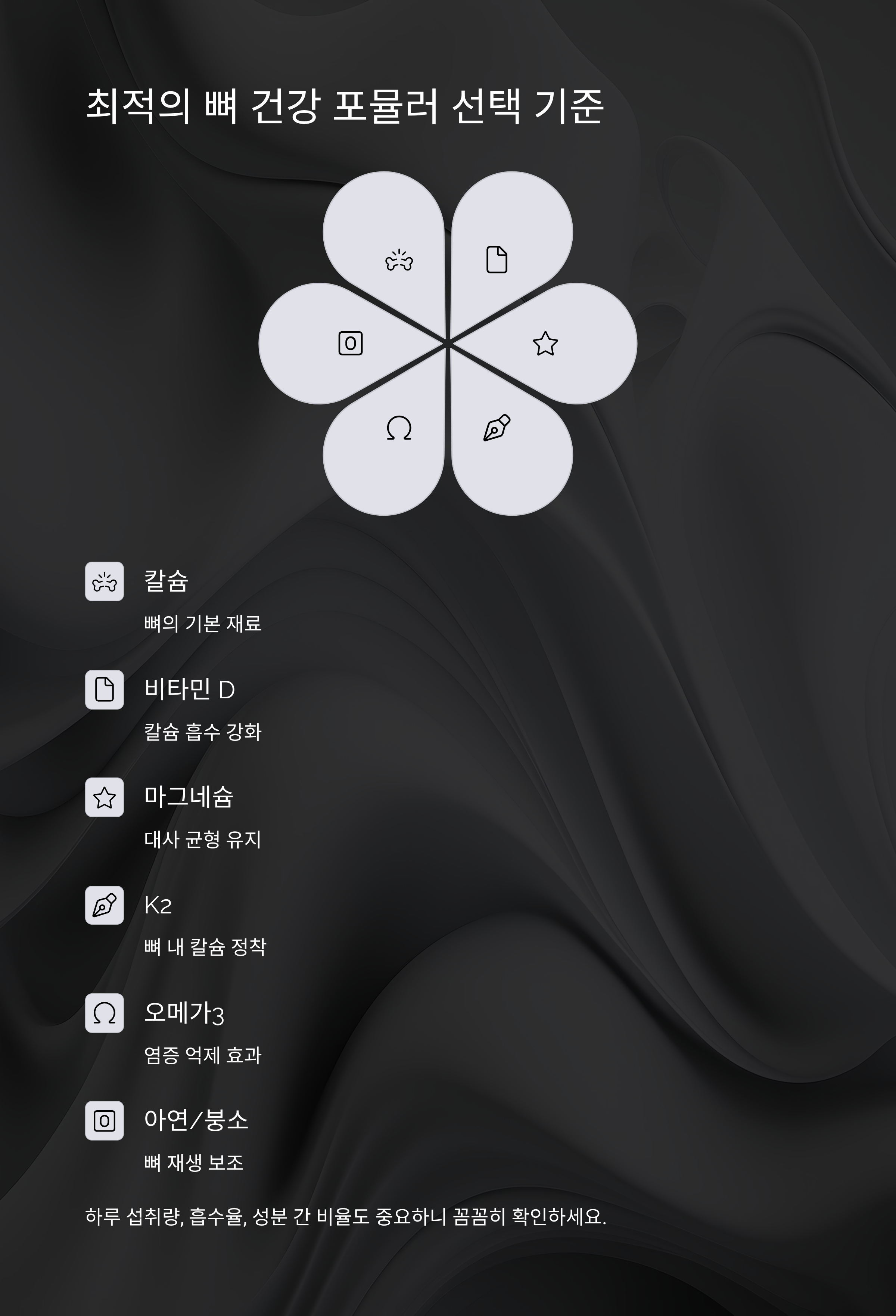 종합 뼈 건강 포뮬러에 반드시 포함되어야 하는 성분들입니다