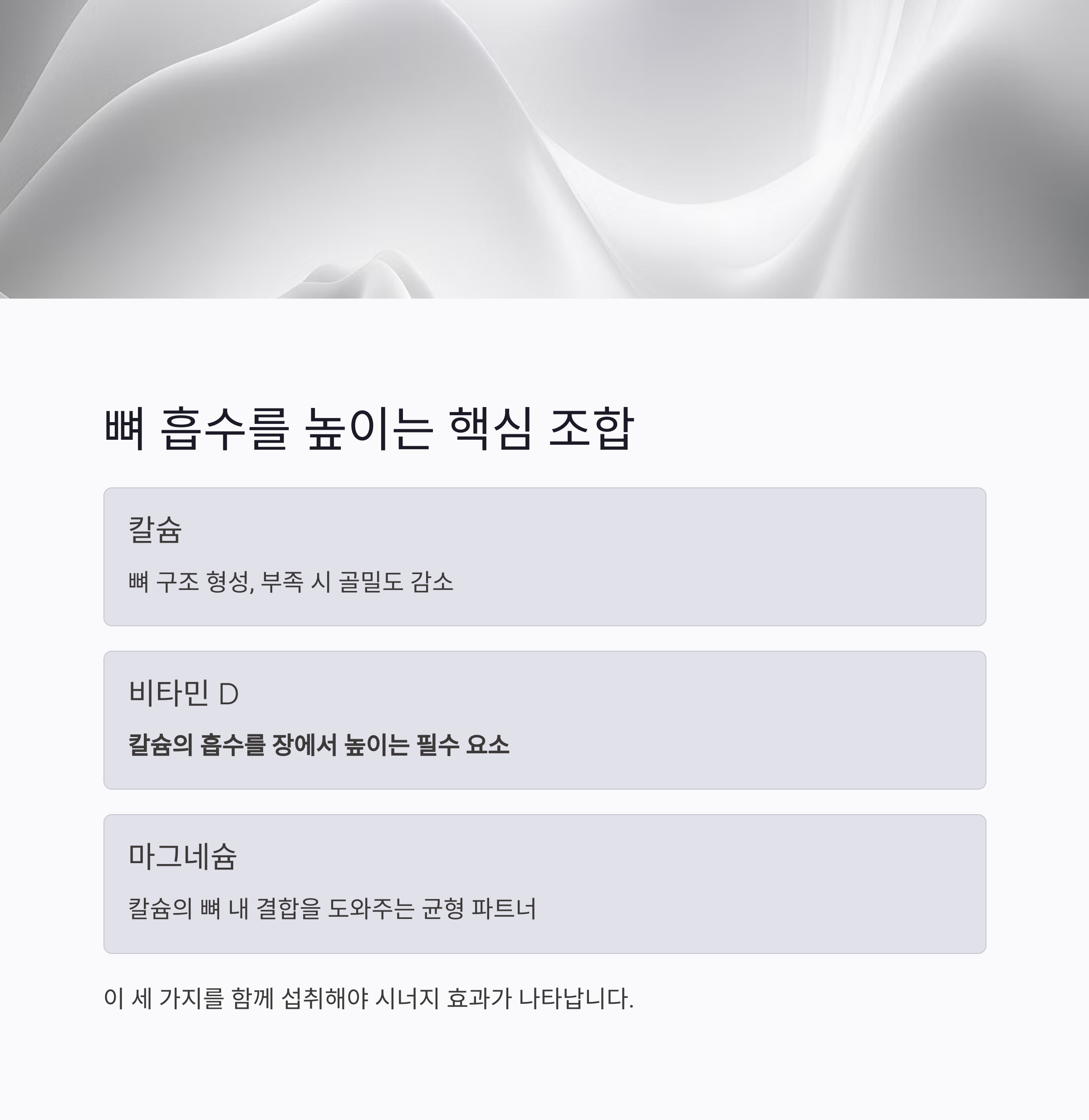 뼈 흡수를 높이는 핵심 조합: 칼슘 + 비타민D + 마그네슘