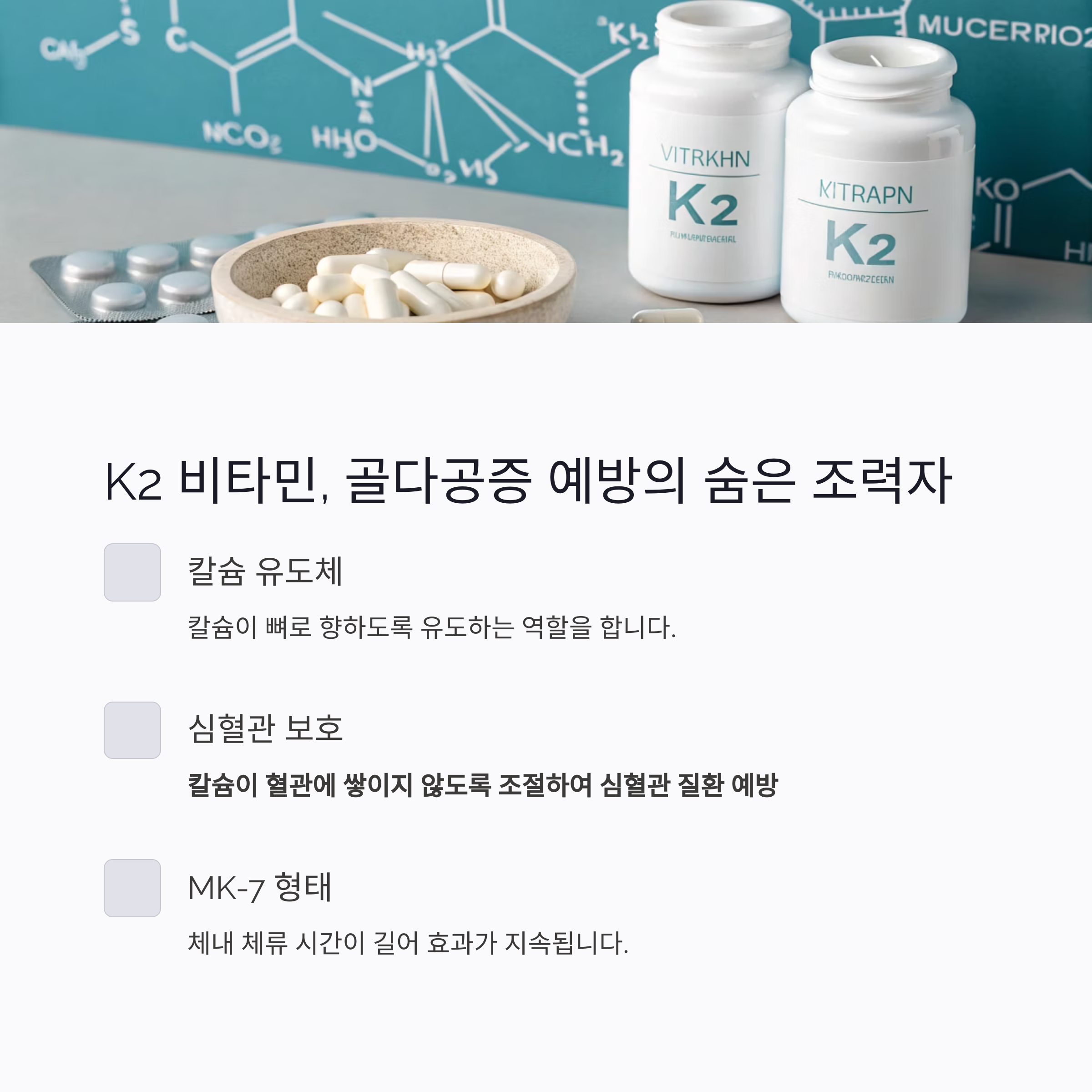 특히 MK-7 형태의 K2는 체내 체류 시간이 길어 효과가 지속됩니다