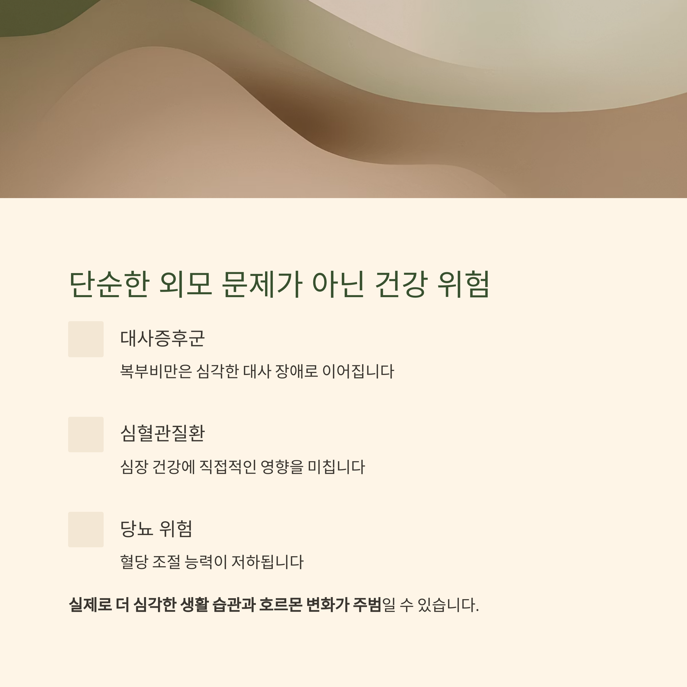 대사증후군, 심혈관질환, 당뇨 등 중대한 건강 위험으로 직결됩니다.