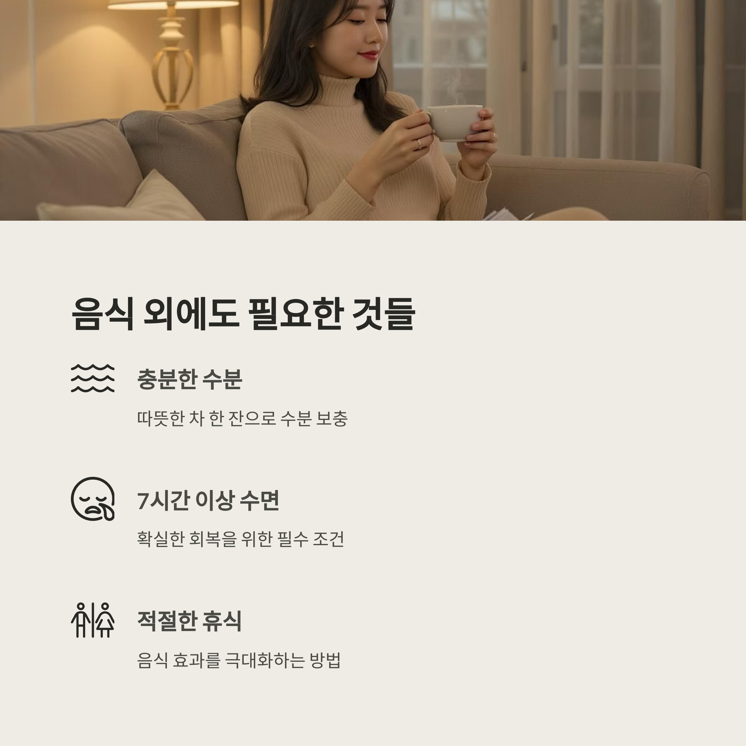 음식 외에도 충분한 수분과 휴식이 필수